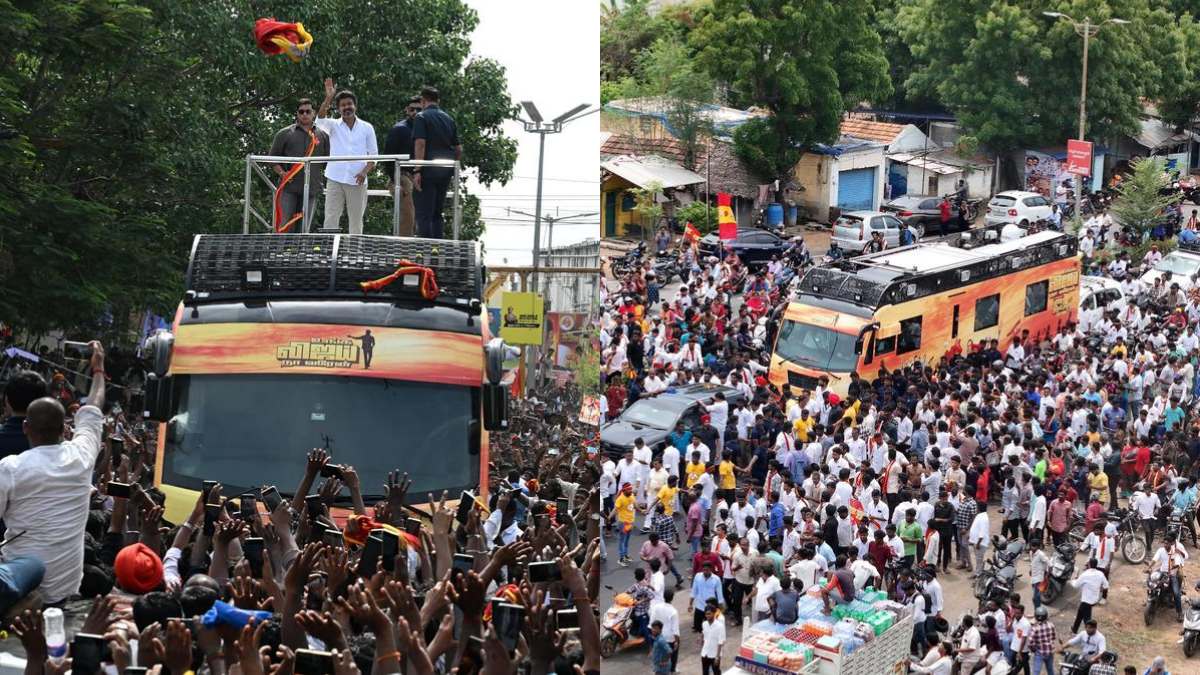 ஏப்ரல் 9ஆம் தேதி கடலூரில் பிரச்சாரம் என அறிவிக்கப்பட்டு அது 11 ஆம் தேதிக்கு ஒத்தி வைக்கப்பட்டது. இதையடுத்து நேற்று ஏப்ரல் 10-ஆம் தேதி காரைக்குடியில் விஜய் பிரச்சாரத்திற்கு ஏற்பாடு செய்யப்பட்டிருந்தது. ஆனால் அனுமதிக்கப்பட்ட நேரத்தை தாண்டி அவர் பிரச்சாரம் செய்ய வந்ததால் ஒரு வார்த்தை கூட பேசாமல் வேட்பாளரை அழைத்து அவரது கையை உயர்த்தி காட்டி, அவருக்கு வாக்களிக்குமாறு செய்கையிலேயே பேசினார். அவரது பேச்சை கேட்க கொளுத்தும் வெயிலில் மணிக்கணக்கில் நின்றிருந்தவர்கள் ஏமாற்றமடைந்தனர்.