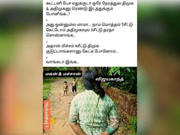 தேமுதிக கூட்டணி இழுபறி குறித்த மீம்ஸ் ஒன்று வைரலாகி வருகிறது.