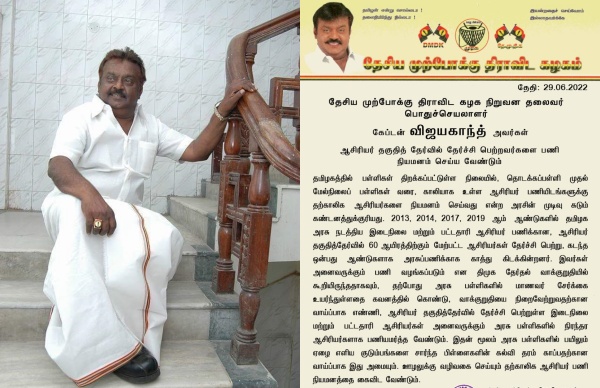 இதன் மூலம் அரசு பள்ளிகளில் பயிலும் ஏழை எளிய குடும்பங்களை சார்ந்த பிள்ளைகளின் கல்வித்தரம் காப்பதற்கான வாய்ப்பாக இது அமையும். ஊழலுக்கு வழிவகை செய்யும் தற்காலிக ஆசிரியர் பணி நியமனத்தை அரசு உடனடியாக கைவிட வேண்டும் என்று குறிப்பிட்டுள்ளார் விஜயகாந்த்.