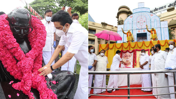 சென்னை வள்ளுவர் கோட்டத்தில் உள்ள அவரது திருவுருவ படத்திற்கு திமுகதலைவர் மு.க.ஸ்டாலின் மலர்தூவி, திருவுருவச் சிலைக்கு மாலை அணிவித்து மரியாதை செலுத்தினார்.
