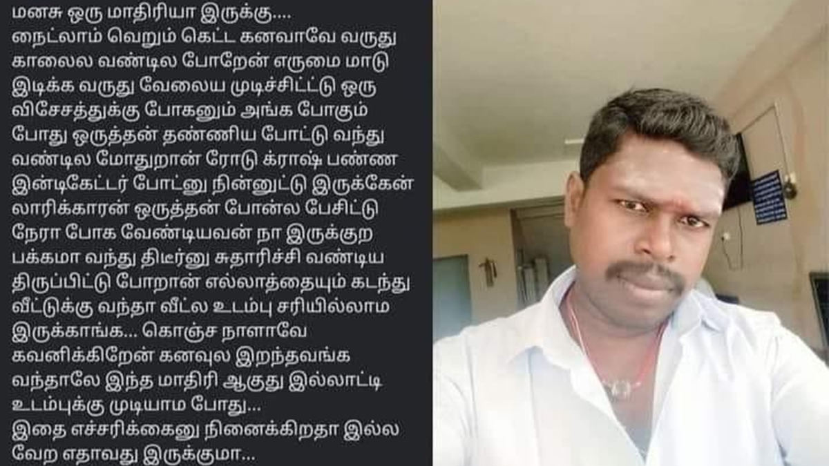 லாரிக்காரன் ஒருத்தன் போனில் பேசிகிட்டு நேராக போக வேண்டியன், நான் இருக்கும் பக்கம் வந்து சுதாரிச்சு திருப்பிட்டு போகிறான். எல்லாத்தையும் கடந்து வீட்டுக்கு வந்தால் வீட்டில் உடம்பு சரியல்லாமல் இருக்காங்க.. கொஞ்ச நாளாகவே கவனிக்கிறேன்.. கனவுல இறந்தவங்க வந்தாலே இந்த மாதிரி ஆகிறது.. இல்லாட்டி உடம்புக்கு முடியாமல் போகிறது.. இதை எச்சரிக்கை என்று நினைக்கிறதா அல்லது வேறு ஏதாவது இருக்குமா? ' என்று பதிவிட்டிருந்தார். அடுத்த நாள் அவர் உயிருடன் இல்லை.. ஆறுமுகம் என்கிற அவர், காரியமங்கலத்தில் நடந்த விபத்தில் இறந்துவிட்டார். இந்த பதிவு தற்போது சமூக ஊடகங்களில் வேகமாக பரவி வருகிறது.