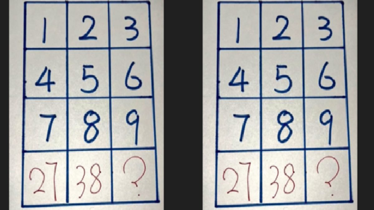 படத்தில் கொடுக்கப்பட்டுள்ள எண்களை முதலில் பாருங்கள். நெடுவரிசையாக கவனியுங்கள். அதாவது மேலிருந்து கீழ் பாருங்கள்.. 1, 4, 7, 27 என்று உள்ளது. இரண்டாம் நெடுவரிசையில் 2, 5, 8, 38 என்று உள்ளது. மூன்றாவது நெடுவரிசையில் 3, 6, 9, ? இடம் பெறுள்ளது. இதில் கேள்விக்குறி இருக்கும் இடத்தில் என்ன விடை என்று தான் நீங்கள் கண்டுபிடிக்க வேண்டும்.
