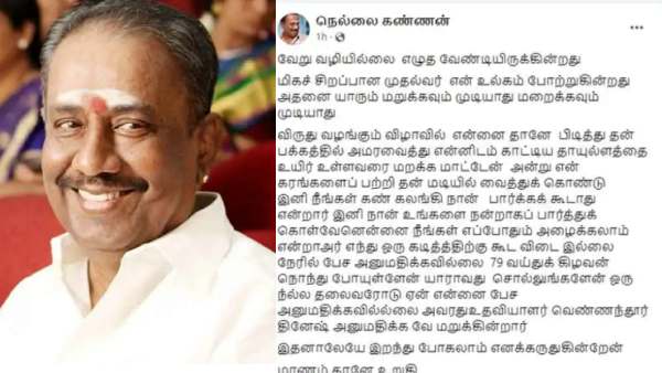 இந்நிலையில், நெல்லைக்கண்ணன் தற்போது ஒரு அதிர்ச்சி தகவலை பதிவு செய்துள்ளார்.. 79 வயதுக் கிழவன் நொந்து போயுள்ளேன். யாராவது சொல்லுங்களேன் ஒரு நல்ல தலைவரோடு ஏன் என்னை பேச அனுமதிக்கவில்லை என்று தன்னுடைய முகநூலில் கேள்வி ஒன்றை எழுப்பியுள்ளார்.. தன்னுடைய ஃபேஸ்புக் பதில், வேறு வழியில்லை எழுத வேண்டியிருக்கின்றது. மிகச் சிறப்பான முதல்வர் என உலகம் போற்றுகின்றது. அதனை யாரும் மறுக்கவும் முடியாது மறைக்கவும் முடியாது.