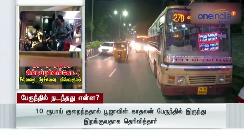 அதனால் பூஜா கண்டக்டரிடம், "10 ரூபா குறையுது.. அதனால் நான் மட்டும் பஸ்ஸில் வர்றேன்.. என் நண்பர் இறங்கிடட்டும்" என்று சொல்லி உள்ளார். ஆனால் கண்டக்டர் காதிலேயே போட்டுக் கொள்ளாமல், 2 டிக்கெட்டைக் கிழித்துவிட்டார். அந்த டிக்கெட்டுகளுக்கு பணம் தந்துட்டுத்தான் கீழே இறங்கணும் என்றும் சொல்லி உள்ளார்.