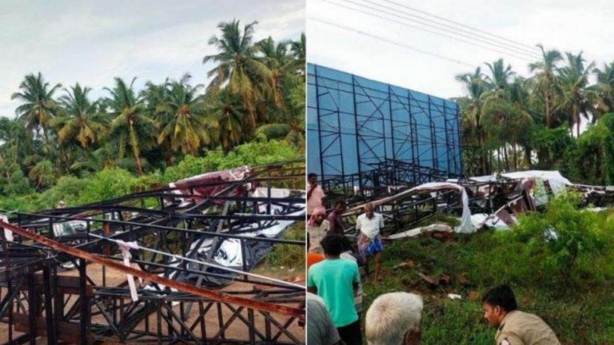 காற்றின் வேகம் அதிகமாக இருந்ததால் இரும்பு தூண்கள் அசைந்துள்ளது. இதனால், பேனர் மட்டும் மாட்டிக் கொண்டு இருந்த தொழிலாளர்கள் பீதி அடைந்தனர். உடனடியாக இறங்க முயற்சித்ததாக கூறப்படுகிறது. காற்றின் வேகமும் தொழிலாளர்கள் ஒரே பக்கமாக இறங்கியதாலும் 60 அடி உயரத்தில் பிரம்மண்ட உயரத்தில் இருந்த அந்த இரும்பு தூண் சரிய தொடங்கியது.
