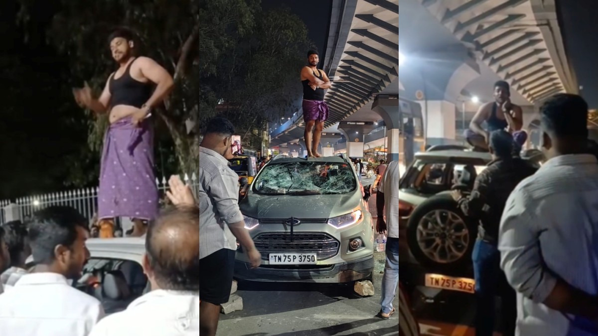 ஆனால் கார் நிறுத்தாமல் வேகமாக சென்றது. ஒருகட்டத்தில் பொதுமக்கள் ஆக்ரோஷமாகி காரின் கண்ணாடிகளை உடைத்து நிறுத்தி, காரை சூழ்ந்தனர். பிறகு காரை வேகமாக இயக்கி மக்களை அச்சுறுத்திய அந்த இளைஞரையும் தாக்கினர். காரில் இருந்த இளைஞரை வலுக்கட்டாயமாக கீழே இறக்கினார்கள். அவர் வேஷ்டி மற்றும் பனியன் அணிந்திருந்தார்.
