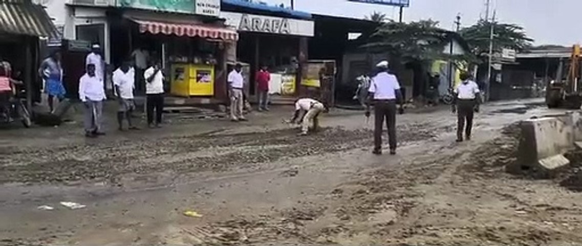 இந்த நிலையில் அந்த சாலையை போக்குவரத்து போலீஸார் மண்வெட்டியை வைத்து சீரமைத்துள்ளனர். இதுகுறித்த வீடியோ வைரலாகி வருகிறது. அந்த சாலையில் போக்குவரத்து போலீஸார் ஒருவர் மண்வெட்டியை கையில் எடுத்து அங்கிருந்த சேற்றை வாரி ஒரு புறமாக குவித்தனர். அதன் பின்னர் ஜேசிபி வாகனம் வந்தது.