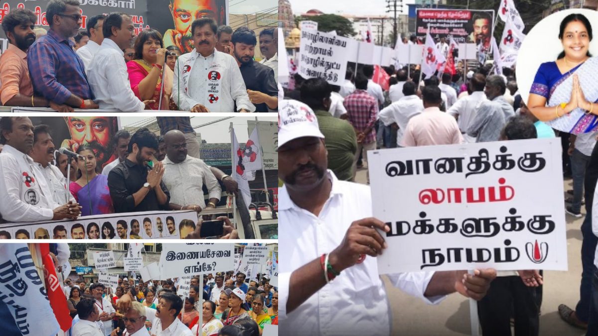 இந்த ஆர்ப்பாட்டத்தின்போது 'வானதிக்கு லாபம்.. மக்களுக்கு நாமம்' என்றும், கோவை தெற்கு எம்.எல்.ஏ வானதி சீனிவாசன் தேர்தலுக்கு முன்பு கொடுத்த வாக்குறுதிகளைக் குறிப்பிட்டு, அவை எங்கே என்றும் கேள்வி எழுப்பும் வகையில் பதாகைகளை ஏந்தி இருந்தனர்.