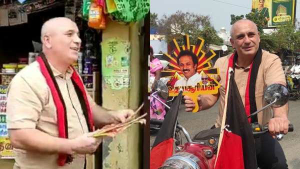 இந்த நிலையில் கோவையில் ருமானியா நாட்டை சேர்ந்த ஒருவர் உதயசூரியன் சின்னம் வைக்கப்பட்ட புல்லட் வாகனத்தில் வந்தார். அவரது பின்னால் இளைஞர் ஒருவர் திமுக கொடி பிடித்துக் கொண்டு வந்தார். வாகனத்தை விட்டு இறங்கிய ருமானியா நாட்டுக்காரர் கழுத்தில் திமுக கழக துண்டை அணிந்திருந்தார்.