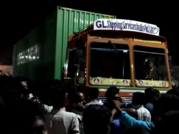 ஆனால் நம்ப மறுத்த மக்கள் அதனை தங்கள் முன் திறந்துகாட்ட வேண்டும் என கோரினர். இதையடுத்து பொதுமக்களை கலைந்து செல்லுமாறு போலீசார் கூறினார்கள். ஆனால் மறுத்ததால் போலீசார் லேசான தடியடி நடத்தி கூட்டத்தை கலைத்தனர்.அதன்பின் போலீசாரால் கண்டெய்னரின் பூட்டை உடைக்க முடியவில்லை. இதனால் லாரியை மாவட்ட ஆட்சியர் அலுவலகத்திற்கு போலீசார் கொண்டு சென்றனர்.