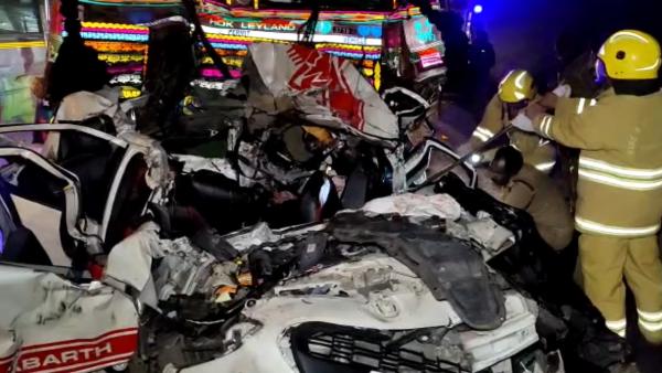 இதில் முன்னால் நின்று கொண்டிருந்த லாரி மீது மோதிய கார், இரு லாரிகளுக்கும் இடையே சிக்கி அப்பளம் போல நொறுங்கியது. இந்த பயங்கர விபத்தில் காரில் பயணம் செய்தவர்கள் உடல் நசுங்கி உயிரிழந்தனர். விபத்தை பார்த்த சக வாகன ஓட்டிகள் பதறியடித்து போலீசாருக்கு தகவல் கொடுத்தனர். விரைந்து வந்த போலீசார் மற்றும் தீ அணைப்பு வீரர்கள் மீட்பு பணியில் ஈடுபட்டனர்.