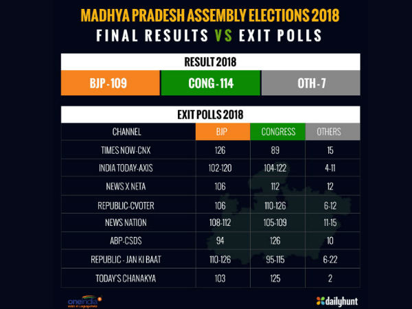 மத்திய பிரதேசத்தில் பாஜக 102-120 தொகுதிகளை வெல்லும் என்று இந்தியா டுடே எக்சிட் போல் கூறியது. காங்கிரஸ் 104-122 தொகுதிகளை வெல்லும் வாய்ப்பு இருப்பதாகவும், மத்திய பிரதேசத்தில் ஆட்சியை பிடிக்க கடும் போட்டி இருக்கும் என்றும் இந்தியா டுடே கணிப்பு வெளியிட்டது. ஏறத்தாழ இது உறுதியாகியுள்ளது. இரு கட்சிகளுமே தலா 110 தொகுதிகளில் முன்னிலை வகித்து வருகின்றன. ஆனால், மத்திய பிரதேசத்தில் மீண்டும் பாஜக ஆட்சி மலரும் என்று டைம்ஸ் நவ் கூறியது. 126 தொகுதிகளை பாஜக கைப்பற்றும் என்றும் காங்கிரஸ் கூட்டணி 89 தொகுதிகளை வெல்லும் என்றும் டைம்ஸ் நவ் கூறியது. ஆனால் காங்கிரஸ் அங்கு அதிக தொகுதிகளில் முன்னிலை வகிக்கிறது. ராஜஸ்தானை தவிர்த்து பார்த்தால் இந்தியா டுடே ஆக்சிஸ் எக்சிட் போல் முடிவுகள் ஏறத்தாழ சரியாக டிரெண்ட்டை கணித்துள்ள. பிற டிவி சேனல்கள் பல மாநிலங்களில் சறுக்கியுள்ளன என்பது தெரிகிறது.