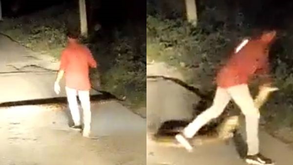 சாலையின் குறுக்கே கிடந்த10 அடி நீள பாம்பு.. ஒரே செகண்ட் தான்..அலேக்காக தூக்கிய நபர்.. பரவும் வீடியோ!