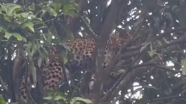 'கம்பீரமாக மேலே ஏறிய சிறுத்தைப்புலி.. எப்படி இறங்குவது என்று தெரியாமல்.. யாராவது உதவி செய்யுங்கள் என்பது போல சிறுத்தைப்புலி அப்பாவியாக மாமரத்தில் நிற்கிறது'. அவ்வழியாக சென்ற மக்கள் சிறுத்தை சிக்கியிருக்கும் தகவலை வனத்துறைக்கு தெரிவித்தனர். இதையடுத்து வனத்துறையினர் 8 மணி நேர போராட்டத்திற்கு பிறகு சிறுத்தைப்புலியை மீட்டனர். இந்த மீட்பு பணியில் யாருக்கும் எந்த பாதிப்பும் ஏற்படவில்லை.