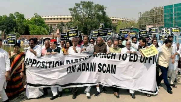 அதானி முறைகேடு புகார் குறித்து அமலாக்கத்துறை விசாரணை நடத்த வேண்டும் என காங்கிரஸ் உள்ளிட்ட 18 கட்சி தலைவர்கள் டெல்லியில் பேரணி சென்றனர்.