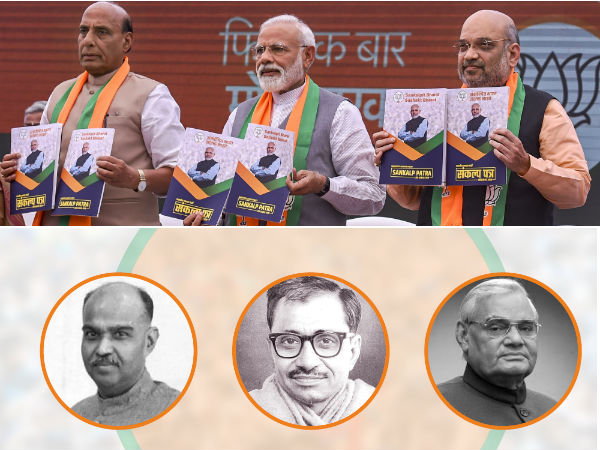 பிரதமர் மோடி, அமித் ஷா, ராஜ்நாத் சிங் ஆகியோரின் படங்கள் இடம் பெற்றுள்ளன. அதைத் தவிர ஷாமா பிரசாத் முகர்ஜி, தீனதயாள் உபாத்யாயா, வாஜ்பாய் ஆகியோரின் படங்கள் இடம் பெற்றுள்ளன. அவர்கள் மறைந்த தலைவர்கள் என்ற அடிப்படையில் இடம் பெற்றிருக்கலாம் என்று தெரிகிறது. இதில் ஷாமா பிரசாத் படத்திற்குக் கீழே தேசியவாதம் என்றும், தீனதயாள் படத்தின் கீழே அந்தியோதயா என்றும், வாஜ்பாய் படத்தின் கீழே நல்லாட்சி என்றும் வாசகம் இடம் பெற்றுள்ளது.