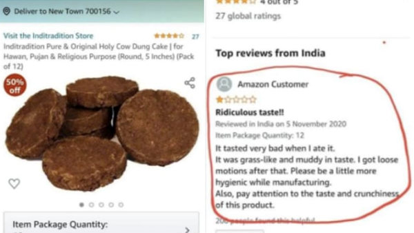 இருந்தும், வித்தியாசமாக ஏதாவது செய்ய வேண்டும் என நினைப்பவர்களில் ஒருவர், மாட்டு சாணத்தை கொண்டு தயாரிக்கப்படும் வரட்டியை ரூ.192 க்கு வாங்கி, அதை சாப்பிட்டும் பார்த்துள்ளார். இந்த பொருள் பற்றிய கருத்தை அமேசான் இணையதளத்தில் பதிவிட்டுள்ளார். அதில், இதன் சுவை மோசமாக உள்ளது.