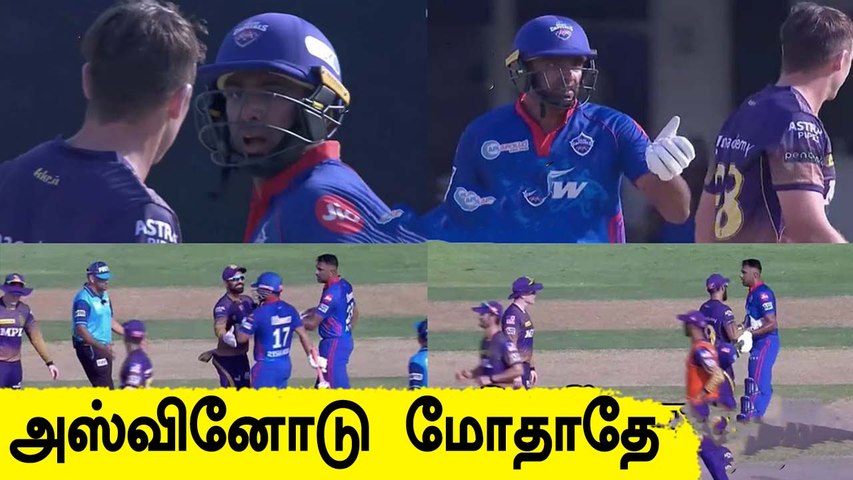 இந்த நிலையில்தான், டிம் சவுதி வீசிய 20 ஓவரின் முதல் பந்தில் அஸ்வின் கேட்ச் கொடுத்து ஆட்டமிழந்தார். அஸ்வின் வெளியேறும்போது சவுதி அவரிடம் ஏதோ கூறினார். அதற்கு அஸ்வின் பதிலுக்கு ஏதோ வார்த்தை கூற வாக்குவாதம் நடந்தது. குறுக்கே விலக்கி விட வந்த கொல்கத்தா கேப்டன் மோர்கனும், அஸ்வினுடன் வாய் தகராறு செய்தார். விக்கெட் கீப்பர் தினேஷ் கார்த்திக் ஓடி வந்து அஸ்வினிடம் தமிழில் பேசி சமாதானம் செய்து அங்கிருந்து அனுப்பி வைத்தார்.
