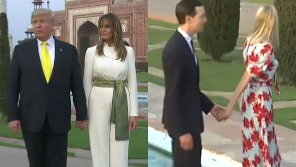 இவர்களை போலவே,மகள் இவாங்காவும், அவருடைய கணவரும் கட்டியணைத்தபடி தாஜ்மஹாலை பார்வையிடுகிறார்கள். அப்பாவும் அம்மாவும் ஒரு பக்கம், மகளும் மருமகனும் இன்னொரு பக்கம் என ஜோடி போட்டு பிரிந்து போய் தாஜ் மஹாலைப் பார்த்து நெகிழ்ந்தனர். இவர்கள் 4 பேரையும் பார்க்கும்போது, தாஜ்மஹாலுக்குள் நுழைந்தவுடன் தங்களையே மறந்தநிலையில் உள்ளது போல தெரிகிறது.. தாயும், மகளும் இருவருமே வெட்கப் புன்னகையுடன் வலம் வந்தனர். ஆனால் தங்கள் கணவன்மார்களின் கைகளை மட்டும் விடவேயில்லை.