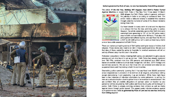 அந்த கட்டுரையில் டெல்லி போலிசின் நடத்தை குறீத்து, ஒருபக்க சார்பான அறிக்கை உள்ளது, அதில் ஆபத்தான வெளிப்படையான பொய்கள் கலந்தது தெரிவிக்கப்பட்டுளள்து. இந்த கட்டுரை தெளிவாக இந்தியாவின் காவல்துறை மற்றும் நீதிதுறை உள்ளிட்ட இந்திய நிறுவனங்களை இழிவிப்படுத்தி அவதூறு செய்வதற்கான ஒருங்கணைந்த முயற்சியாக உள்ளது.