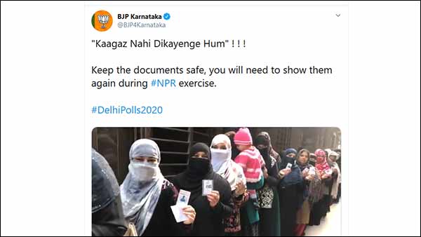 பெங்களூர்: டெல்லி சட்டசபை தேர்தலில் முஸ்லிம் பெண்கள் வாக்களிக்க வரிசையில் நிற்க கூடிய ஒரு வீடியோவை பயன்படுத்தி, கர்நாடக பாஜக தனது ட்விட்டர் கணக்கில் பகீர் ட்விட்டை வெளியிட்டுள்ளது.