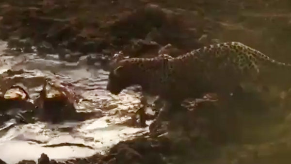 குழம்பிய குட்டையில் மீன் பிடிக்கும் சிறுத்தை... எல்லாம் பசிக்கொடுமை.. வேறென்னத்தச் சொல்ல..!