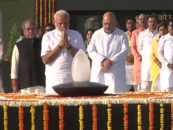 இதற்கான விழா ஏற்பாடுகள் கோலாகலமாக நடைபெற்று வருகிறது. இந்நிலையில் மகாத் காந்தியின் நினைவிடத்தில் மோடி அஞ்சலி செலுத்தினார். ராஜ்காட்டில் உள்ள மகாத்மா காந்தி நினைவிடத்தில் பிரதமர் மோடி, பாஜக தலைவர் அமித்ஷா மற்றும் மத்திய அமைச்சர்களும் மரியாதை செலுத்தினர்.