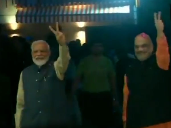 இரவு சுமார் 7 மணியளவில் பிரதமர் மோடி மற்றும் அமித் ஷா இருவரும், பாஜக தலைமை அலுவலகம் வருகை தந்தனர். அப்போது சுற்றிலும் நின்ற, ஆயிரக்கணக்கான தொண்டர்கள் அவர்கள் மீது ரோஜா பூக்களை தூவி, ஹீரோ வெல்கம், என்ற வகையில் வரவேற்பு அளித்தனர்.