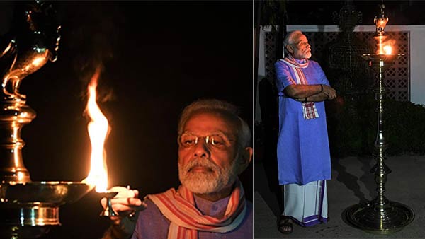 இந்நிலையில் ஊரையே விளக்கு ஏற்ற சொன்ன பிரதமர் மோடி, அவரும் தமிழர்களின பாரம்பரிய உடையான வேஷ்டி மற்றும் ஜிப்பா அணிந்தபடி தீபம் ஏற்றி மனம் உருகி பிரார்த்தனை செய்தார். இந்த படத்தை அவர் தனது டுவிட்டர் பக்கத்தில் பதிவிட்டுள்ளார்.