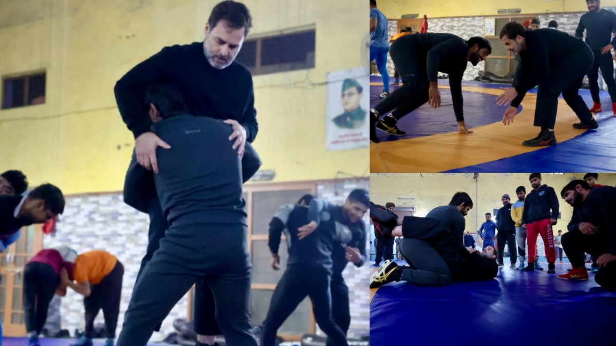 ஆறுதலுக்கு பின் சண்டை.. மல்யுத்த வீரர் பஜ்ரங் புனியாவுடன் கட்டிப்புரண்டு "மோதிய" ராகுல் காந்தி