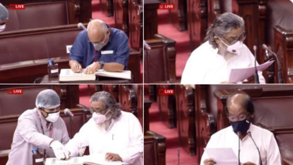 ராஜ்யசபாவில் முதலில் புதிய எம்.பிக்கள் பதவியேற்றனர். தமிழகத்தில் இருந்து ராஜ்யசபாவுக்கு தேர்ந்தெடுக்க திமுக எம்.பி.க்கள் திருச்சி சிவா, அந்தியூர் செல்வராஜ், என்.ஆர். இளங்கோ ஆகியோர் பதவியேற்றனர். இவர்கள் மூவரும் தமிழில் உறுதிமொழி ஏற்றனர்.