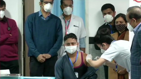 டெல்லி எய்ம்ஸில் துப்பரவு தொழிலாளிக்கு முதல் தடுப்பூசி..மருத்துவமனை இயக்குனரும் தடுப்பூசி போட்டார்!