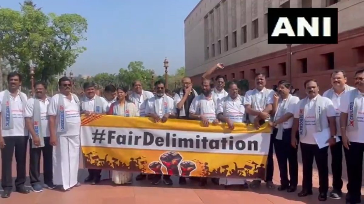 டெல்லி: தொகுதிகள் மறுசீரமைப்பு தொடர்பாக நாடாளுமன்றத்தில் விவாதிக்க மறுக்கும் மத்திய பாஜக தலைமையிலான தேசிய ஜனநாயகக் கூட்டணி அரசுக்கு கண்டனம் தெரிவித்து நாடாளுமன்ற வளாகத்தில் இன்று 2-வது நாளாக தமிழக எம்பிக்கள் போராட்டம் நடத்தினர். இந்தப் போராட்டத்தின் போது நீதியான தொகுதி மறுசீரமைப்பை மேற்கொள்! என்பது உள்ளிட்ட வாசகங்களுடனான டி சர்ட் அணிந்து தமிழக எம்பிக்கள் முழக்கம் எழுப்பியது கவனம் ஈர்த்தது.