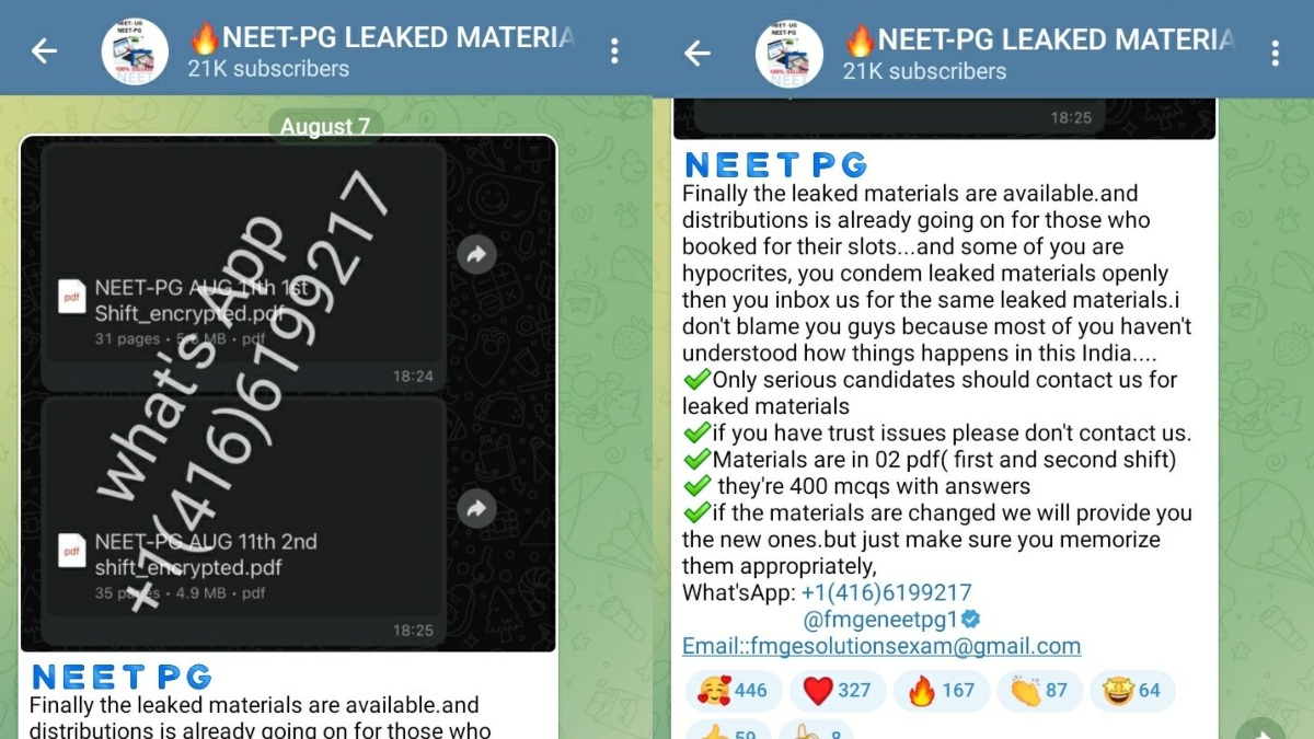 அந்த டெலிகிராம் குழுவில் 20 ஆயிரத்துக்கும் மேற்பட்டவர்கள் உறுப்பினர்களாக உள்ளனர் என்றும் தகவல் வெளியாகியுள்ளது. உண்மையிலேயே நீட் முதுநிலை வினாத்தாள் கசியவிடப்பட்டு உள்ளதா, அல்லது ஏமாற்றி பணம் பறிக்கும் நோக்கத்தோடு மர்ம கும்பல் போலியாக வினாத்தாளை பரப்பி வருகிறதா என விசாரணை நடந்து வருவதாக கூறப்படுகிறது.