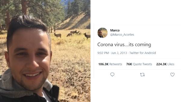 இந்த நிலையில் இந்த கொரோனா வைரஸை 8 ஆண்டுகளுக்கு முன்பே கணித்துள்ளார் ஒருவர். என்னதான் இது கேட்பதற்கு நம்பத்தகுந்ததாக இல்லாவிட்டாலும் இது உண்மைதான். இதற்கு ஆதாரங்களும் உள்ளன. ஆம் 2013-இல் மார்கோ அகார்டேஸ் என்பவரின் ட்வீட் வைரலாகி வருகிறது.