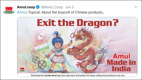 டிராகன் படத்துக்குப் பின்னால் டிக் டாக் செயலி படமும் இடம்பெற்றிருந்தது. சீன பொருட்களை புறக்கணிக்க வேண்டும் என்ற கோஷம் இந்தியாவில் அதிகரித்து வரும் நிலையில் இதுபோன்ற ஒரு கார்ட்டூன் அமுல் நிறுவனத்தால் வெளியிடப்பட்டது. அமுல் நிறுவனம் பல்வேறு விவகாரங்களிலும் கவனம் ஈர்க்கும் வகையில் முன்பும் கார்ட்டூன் வெளியிட்டுள்ளது. எனவே அதன் டுவிட்டர் அக்கவுண்டுக்கு நிறைய ஃபாலோவர்கள் உண்டு.