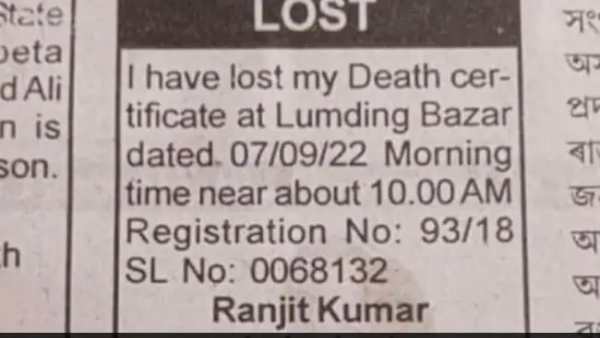 அசாமில் உள்ள நாளிதழில் கடந்த 7 ஆம் தேதியிட்டு வெளியான விளம்பரத்தில், ஒருவர் தனது இறப்பு சான்றிதழ் தொலைந்துவிட்டது. லும்டிங் பசார் பகுதியில் காலை 10 மணியளவில் இந்த சான்றிதழ் தொலைந்துவிட்டது. என்ற விவரங்களுடன் விளம்பரம் இடம் பெற்றுள்ளது. இறப்பு சான்றிதழின் சீரியல் எண்ணும் வெளியிடப்பட்டுள்ளது. ஐபிஎஸ் அதிகாரி ரூபின் சர்மா இந்த விளம்பரத்தை தனது ட்விட்டரில் பகிர்ந்து இருக்கிறார். விளம்பரம் இடம் பெற்றிருந்த பேப்பர் கட்டிங்கை பகிர்ந்து இருக்கும் அவர், இந்தியாவில் மட்டுமே இது நடக்கும் என்ற கேப்ஷனோடு ஸ்மைலியையும் பதிவிட்டுள்ளார்