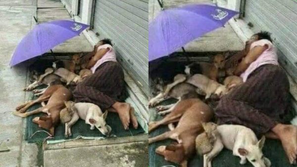 சொல்லப் போனால் அந்தப் பெட்ஷீட்டின் ஒரு ஓரத்தில் சமாளித்துக் கொண்டு அந்த மனிதர் படுத்திருக்கிறார். மீதமுள்ள முக்கால்வாசி இடத்தையும் அந்த வாயில்லாத ஜீவன்கள்தான் ஆக்கிரமித்துள்ளன. அவர் நினைத்திருந்தால் அந்த நாய்களையும், பூனையையும் விரட்டி இருக்கலாம். ஆனால் அவரின் சம்மதத்துடனேயே அவை அங்கேயே படுத்திருப்பது புகைப்படத்தில் நன்றாகத் தெரிகிறது.