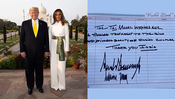 இந்திய கலாச்சாரத்தின் அழகான வளம் மற்றும் பன்முகத்தன்மைக்கு காலமற்ற சான்று. நன்றி இந்தியா என தெரிவித்துள்ளார். அதில் டிரம்பும், மெலானியாவும் கையெழுத்திட்டுள்ளனர். இதையடுத்து அவர்கள் யமுனை நதிக்கரையில் இருந்தபடி இயற்கை எழில் கொஞ்சும் தாஜ்மஹாலின் அழகை ரசித்தனர்.