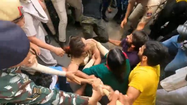 வினேஷ் போகத் மற்றும் அவரது சகோதரி சங்கீதா போகத் தலைமையிலான மல்யுத்த வீரர்கள் தடைகளைத் தாண்டி செல்ல முயன்ற நிலையில், பதற்றம் ஏற்பட்டது. இதையடுத்து அங்கே தள்ளுமுள்ளு ஏற்பட்டது. இதையடுத்து போராட்டத்தில் ஈடுபட்ட அனைவரும் தடுப்பு காவலில் வைக்கப்பட்டனர்.