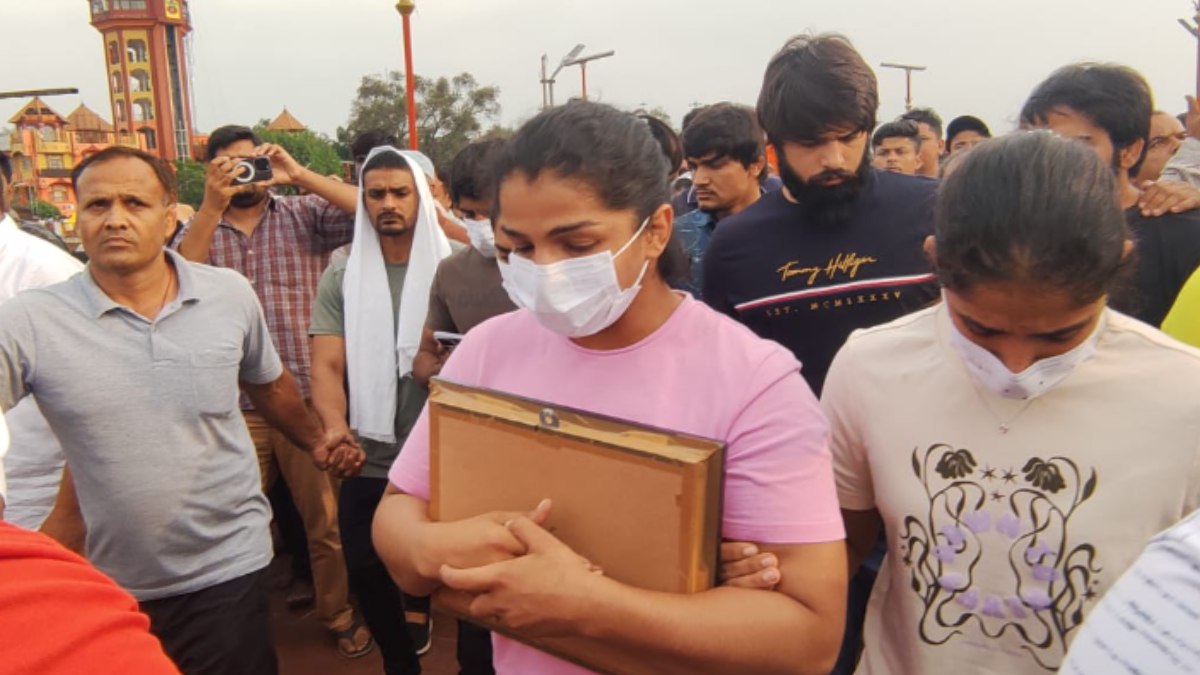 அவர்கள் பதக்கங்களைக் கங்கையில் விடச் சென்று கொண்டிருந்தனர். அப்போது அங்கே வந்த விவசாயச் சங்கத் தலைவர் நரேஷ் டிக்கைட் வீரர், வீராங்கனைகள் பதக்கங்களை வீசக் கூடாது எனக் கேட்டுக் கொண்டார். மேலும், 5 நாட்கள் தங்களுக்கு நேரம் தரும்படியும் அதற்குள் நிச்சயம் இந்த விவகாரத்தில் முடிவெடுக்க முடியும் எனக் கேட்டுக் கொண்டார். விவசாயச் சங்கத் தலைவர் நரேஷ் டிக்கைட், வீரர்களிடம் இருந்து பதக்கங்களையும் பெற்றுக் கொண்டார்.