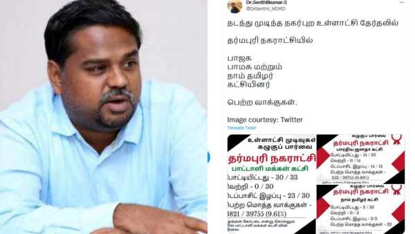 தருமபுரி: நடந்து முடிந்த உள்ளாட்சி தேர்தலில் பாஜக, பாமக, நாம் தமிழர் ஆகிய கட்சிகள் தருமபுரி நகராட்சியில் பெற்ற வாக்குகள் குறித்து திமுக எம்பி செந்தில் குமார் வெளியிட்டுள்ளார்.