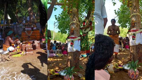அரச மரத்துக்கு பட்டு வேட்டியும் வேப்ப மரத்துக்கு சேலையும் கட்டப்பட்டது. பின்னர் திருமண சடங்கு நடந்தது. மேலும் இரண்டு மரங்களுக்கும் மாலைகள் அணிவிக்கப்பட்டன. தீபாராதனையை தொடர்ந்து மந்திரங்கள் ஓத மேளதாளம் முழங்க கிராம மக்கள் புடைசூழ அரச மரத்திற்கும் வேப்ப மரத்திற்கும் திருமணம் நடந்தது.