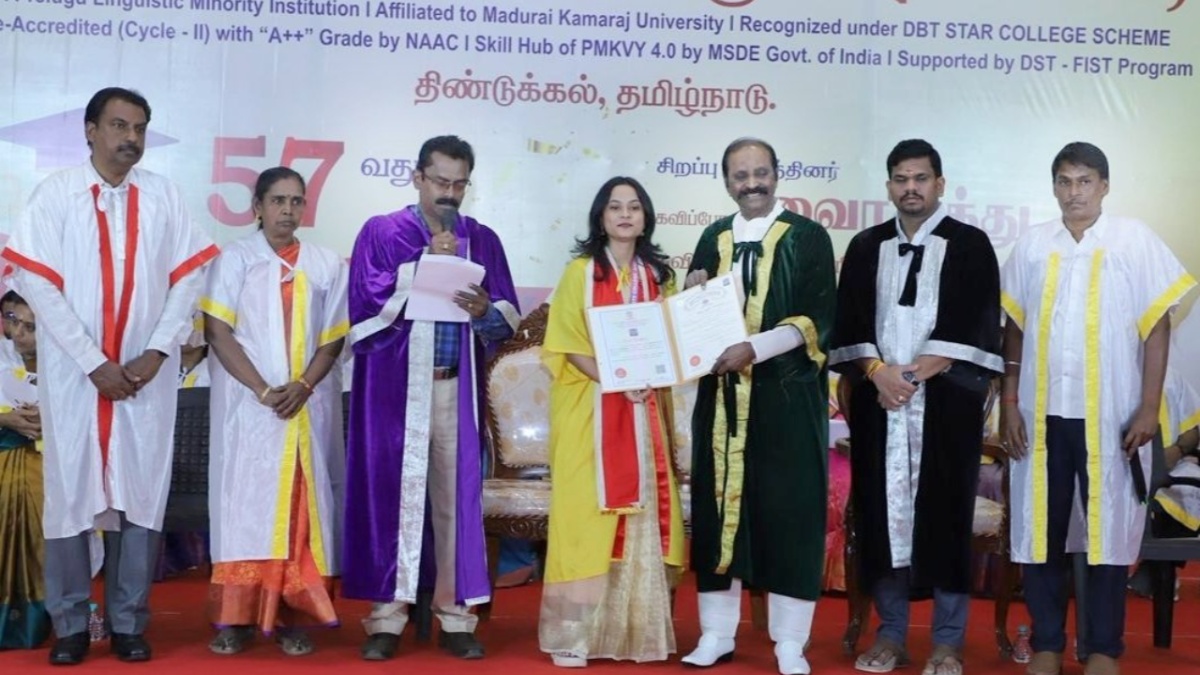 திண்டுக்கல் கரூர் சாலையில் உள்ள ஜிடிஎன் கலைக் கல்லூரியில் 57 வது ஆண்டு பட்டமளிப்பு விழா நடைபெற்றது. இவ்விழாவில் 2021முதல் 23 ஆண்டு முதுகலை மற்றும் 2021 முதல் 24 ஆண்டு இளங்கலை பயின்ற கல்லூரி மாணவ மாணவிகள் 1,416 பேருக்கு பட்டங்கள் இன்று வழங்கப்பட்டது.