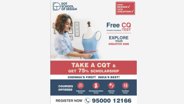 சென்னை: 12ம் வகுப்பிற்கு பிறகு வித்தியாசமான மேற்படிப்பை படிக்க வேண்டுமா? உங்கள் எதிர்காலத்தை மிக சிறப்பாக அமைத்துக் கொள்ள வேண்டுமா? அப்படி என்றால் உங்களுக்காகவே உருவாக்கப்பட்ட கல்லூரிதான் டாட் ஸ்கூல் ஆப் டிசைன் (DOT School of Design). சிறப்பான ஸ்காலர்ஷிப் உதவியுடன் நீங்கள் இங்கு டிசைன் சார்த்த படிப்புகளை படிக்கலாம்.