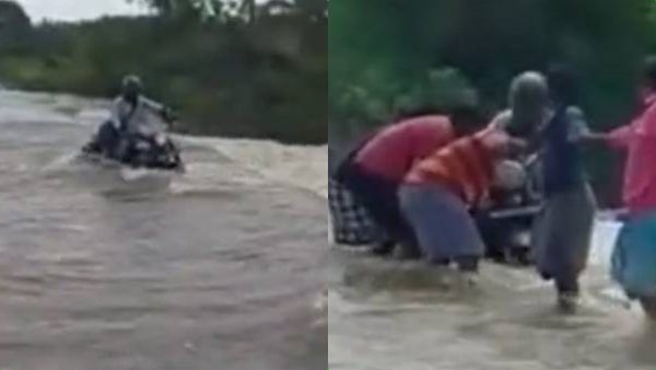 இதை பார்த்த அந்த பகுதி மக்கள் அவரை காப்பாற்ற திட்டமிட்டனர். இதையடுத்து ஆண்கள் அனைவரும் ஒன்றாக இணைந்து மனித சங்கிலி அமைத்தனர். இதையடுத்து அவர்கள் அனைவரும் இணைந்து வெள்ளத்தில் பைக்குடன் சிக்கிய நபரை பத்திரமாக மீட்டனர். தற்போது இந்த வீடியோ இணையதளங்களில் வேகமாக பரவி வருகிறது. துரித செயல்பாடு மற்றும் அனைவரும் ஒன்றிணைந்து மனித சங்கிலி அமைத்து வெள்ளத்தில் சிக்கியவரை மீட்டதை பாராட்டி வருகின்றனர்.