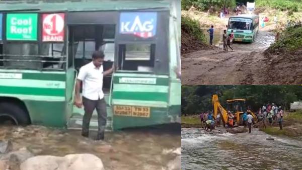 ஈரோடு அருகே திக், திக்.. வெள்ளத்தில் பயணிகளுடன் சிக்கிய அரசு பேருந்து.. கிராம மக்கள் உதவியால் மீட்பு