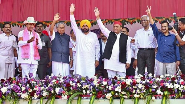 இந்நிலையில் தான் சந்திரசேகர ராவின் இந்த பொதுக்கூட்டம் தேசிய அளவில் கவனம் பெற்றுள்ளது. அவர் 2024 நாடாளுமன்ற தேர்தலில் பாஜக, காங்கிரஸ் இன்றி 3வது அணியை உருவாக்க திட்டமிட்டுள்ளார். இந்நிலையில் தான் தற்போதைய கூட்டத்தில் ஆம் ஆத்மியின் 2 முதல்வர்கள், மார்க்சிஸ்ட் கம்யூனிஸ்ட் கட்சியின் முதல்வரான பினராயி விஜயன், சமாஜ்வாதி தலைவர் அகிலேஷ் யாதவ், இந்திய கம்யூனிஸ்ட் கட்சியின் தேசிய பொதுச்செயலாளர் டி ராஜா உள்ளிட்டவர்கள் பங்கேற்றுள்ளனர். இதனால் இவர்கள் அனைவரும் சந்திரசேகர ராவுடன் வரும் 2024 நாடாளுமன்ற தேர்தலில் கைகோர்ப்பார்களா? என்ற கேள்வி எழுந்துள்ளது. இது தற்போது தேசிய அளவில் பெரும் பேசும்பொருளாக மாறியுள்ளது.