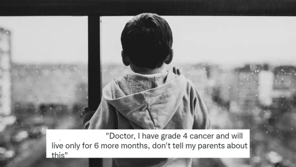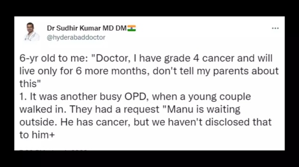 இதையடுத்து, அதே மருத்துவமனையில் உள்ள மூளை நரம்பியல் மருத்துவரான சுதீர் குமார் என்பவரிடம் அந்த சிறுவன் சிகிச்சை பெற்றுக்கொள்ள பரிந்துரைக்கப்பட்டது. இந்த மருத்துவர்தான், ட்விட்டர் பக்கத்தில் இந்த செய்தியை பகிர்ந்துள்ளார். இனி அவரது வார்த்தைகளில் இருந்து. "முதலில் அந்த சிறுவனின் பெற்றோர்தான் என்னை வந்து பார்த்தனர். அப்போது அவர்கள், மகனுக்கு புற்றுநோய் பாதிப்பு இருக்கிறது. ஆனால் அவனிடம் அதை கூற வேண்டாம். வலிப்புக்கும், பக்கவாதத்திற்கும் என்ன மாதிரியான சிகிச்சை அளிக்கப் போகிறீர்கள் என்பதை மட்டும் கூறுங்கள்" என வேண்டுகோள் விடுத்தனர்.