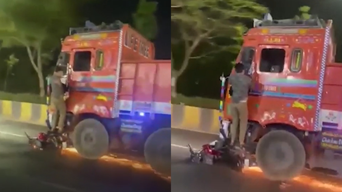 லாரியின் சக்கரத்தில் சிக்கி உள்ள பைக் சாலையில் உரசியபடி செல்வதால் தீப்பொறி பறக்கிறது. மேலும் லாரியில் தொங்கிய நபர் நிறுத்தும்படி கூறியும் டிரைவர் கண்டுக்கொள்ளாமல் ஓட்டி செல்கிறார். இந்த சம்பவம் ஹைதராபாத்தில் நடந்துள்ளது. அதாவது பைக் மீ லாரி ஒன்று மோதி உள்ளது. இதில் லாரியின் சக்கரத்தில் பைக் சிக்க அதிர்ஷ்டவசமாக அதில் பயணித்தவர் உயிர் பிழைக்கிறார்.